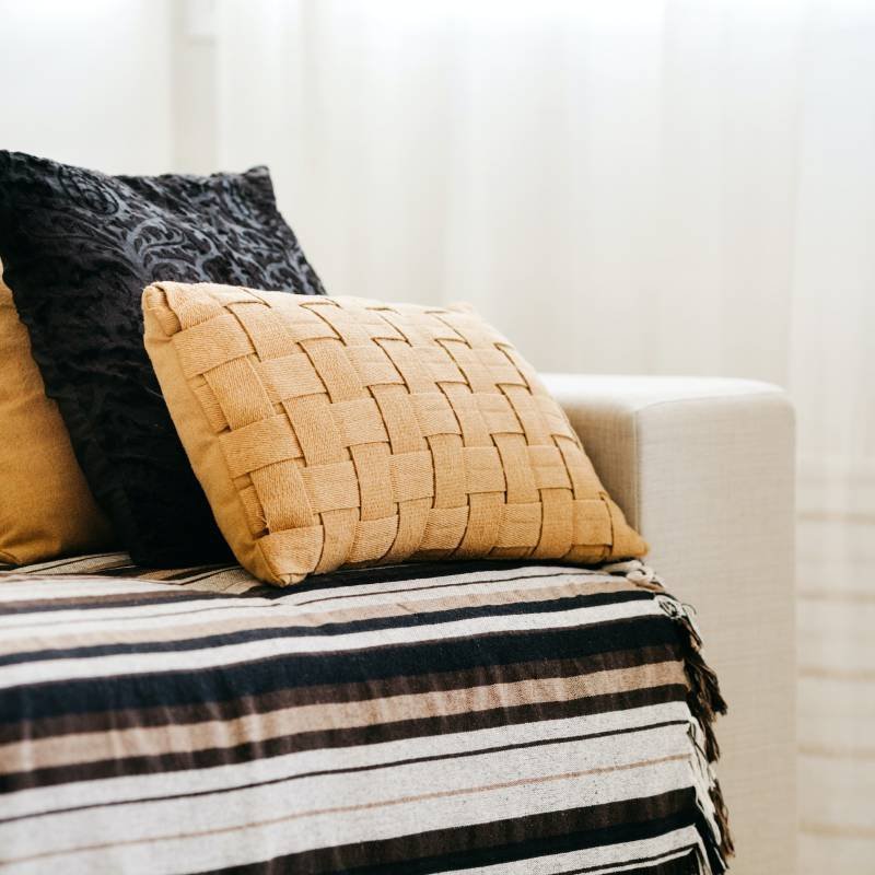 Neutral sofa with cushions, perfect for relaxed Scandinavian style.